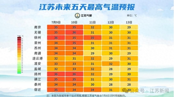 别急,爽快了马上就来!11号开始,整个江苏的天气就真的要变了。各地最高的温度都会往下走,基本就稳定在三十度上下,甚至更低。这比现在的天气好不少吧?