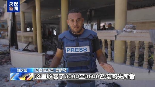 总台报道员 奥萨马:现在我正位于塔宾学校,这里收容了3000至3500名流离失所者。这所学校今天(10日),遭到了三枚导弹的袭击。虽然暂时没有准确的统计数据,但据悉大约有100到120人,在此次袭击中身亡。这里的人们处于恐慌之中,空气中也弥漫着血腥味。