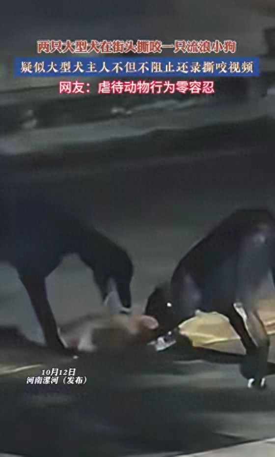 10月12日,河南漯河街头发生令人愤慨一幕:两只大型犬在街头疯狂撕咬一只流浪小狗。现场视频显示,小狗毫无反抗之力,处境凄惨。