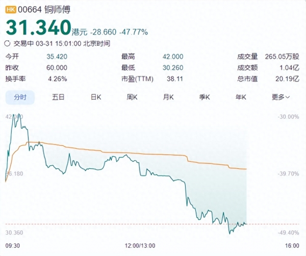然而,其上市首日开盘即破发,铜师傅每股定价60港元,上市首日开盘报35.42港元,较发行价低开40.97%。截至15:01,铜师傅股价报31.34港元/股,跌幅47.77%。