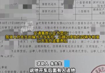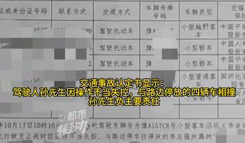 交通事故认定书显示,驾驶人孙先生因操作不当失控,与路边停放的四辆车相撞,负主要责任。