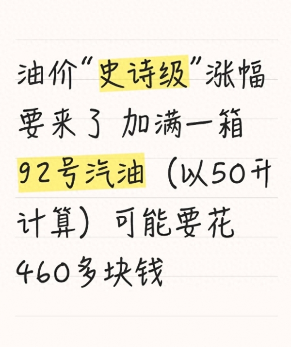 各位车主、跑运输的朋友、普通家庭注意了,国内油价即将迎来2026年以来最大一次上调,不是几毛钱的小波动,而是实打实的"史诗级"大涨。截至2026年3月21日权威机构测算,本轮成品油调价窗口将在3月23日24时正式开启,92号汽油每升预计上调1.7元左右,50升油箱加满一箱,直接逼近470元,日常出行、物流运输、春耕用油成本全线上涨。