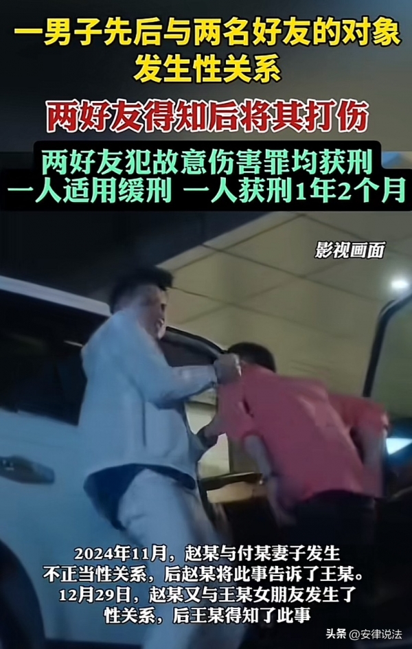"引狼入室!"甘肃,已婚男子接连与2名好友的对象发生关系,结果被2名朋友知道后,打致轻伤。事后,男子2名朋友均因犯故意伤害罪获刑,其中一人被判处有期徒刑1年2个月,另一人因赔偿男子3万元取得男子的谅解,被判处有期徒刑8个月,缓刑1年6个月。