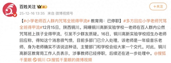 12月16日,据百姓关注报道,近日有网友称铜川高新实验学校一老师在百人群内公然咒骂班上孩子全得甲流,引发不少群友质疑。
