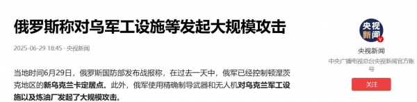 根据俄罗斯国防部 6 月 29 日战报,俄军已经控制了顿涅茨克地区的新乌克兰卡定居点,并继续向西推进至第聂伯罗彼得罗夫斯克州境内。