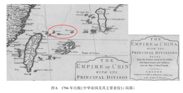 英国1794年出版的《中华帝国及其主要省份》地图,以闽南音译标注了钓鱼岛(Hao-yu-su)、黄尾屿(Hoan-oey-su)和赤尾屿(Tse-oey-su),并用与台湾、福建一样的黄色勾勒,琉球群岛则未着色。(红圈为编辑所加) 夏帆:《从1885年前西方绘制地图看钓鱼岛及其附属岛屿的归属》,《边界与海洋研究》2017年7月 第2卷 第4期。