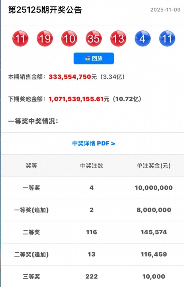 本期大乐透于2025年11月3日晚开奖,摇奖过程公开透明。前区开出号码"10、11、13、19、35",后区开出号码"04、11"。本期全国共中出4注一等奖,单注奖金1000万元,其中2注追加获得800万追加奖金。