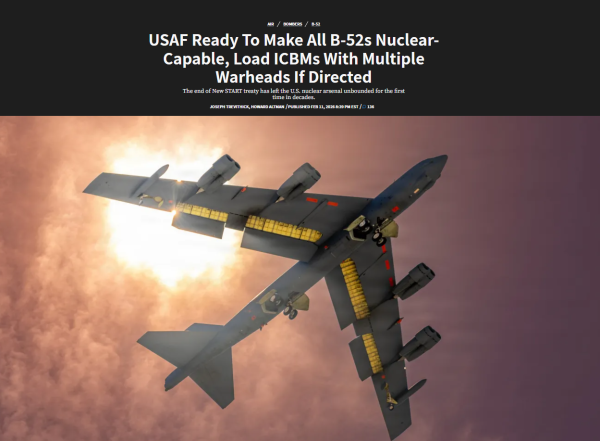 目前美国空军现役76架B-52H轰炸机里,仅有46架被允许携带核武器。而在条约失效以后,根据美国空军和海军的初步意愿,美军计划将所有76架B-52都恢复具备核打击能力。此外,美军计划将处于未部署状态的100枚"民兵Ⅲ"洲际弹道导弹恢复成部署状态,顺便将部分"民兵Ⅲ"洲从条约规定的单弹头改为成多弹头。而在海军方面,美国现役的"俄亥俄"型核潜艇在条约规定下只能携带18枚"三叉戟2D5"潜射洲际弹道导弹,未来美军将把这些弹道导弹核潜艇恢复成满载状态--也就是携带24枚。