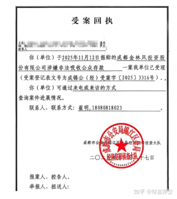 近日,众多"成都金林风投资股份有限公司"及其关联公司的受害人陆续向公安机关报案,案件已于2025年12月被正式受理。