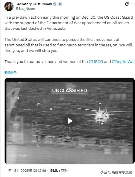 其三,美国开始使用最后的战略压迫手段,试图迫使加拉加斯妥协。12月21日,美媒消息源透露,美军在委内瑞拉沿岸海域突袭并扣押了第二艘油轮,这次是一艘悬挂巴拿马国旗、归属于中国香港公司的"世纪号"油轮(CENTURIES),理由是该船参与"受制裁的石油转移"。报道称,"世纪号"油轮事实上并不在美国政府或任何其它国家的制裁名单上,发布劫船视频的美国国土安全部部长诺姆也没有对此做出任何明确解释。