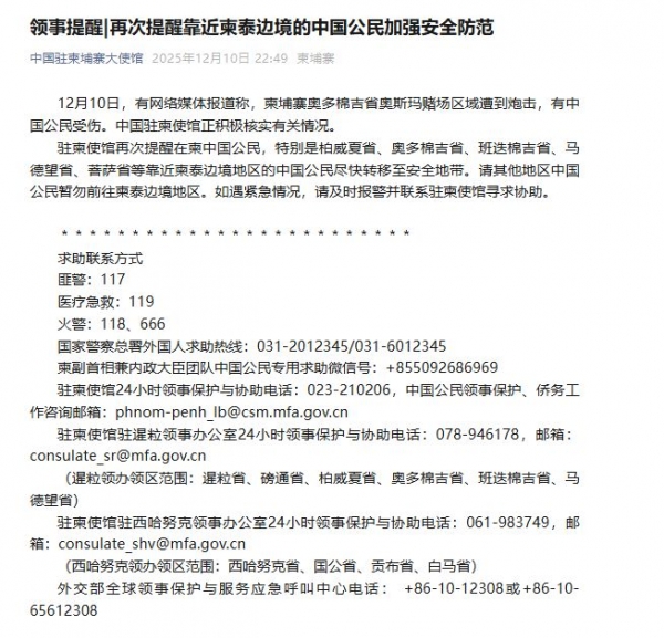 12月10日晚,中国驻柬埔寨大使馆发布提醒: