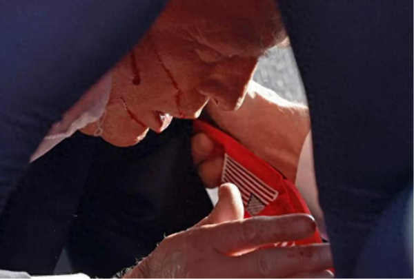 当时他仍然被特勤人员团团围住,但是随后就出现了必然会成为美国历史上经典画面的一幕。在支持者的欢呼声中,在飘扬的美国国旗下,满脸是血的特朗普高举着拳头,振臂高呼"fight",随后在特勤的簇拥下走下了演讲台。