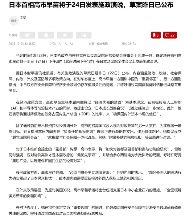 24日,高市早苗将发表上任后的首份施政演说,日媒已经提前公布了内容,其中在涉华部分,高市早苗称中国为"重要邻国",同时强调中日在安保和经济安全领域存在需要关注的问题,她呼吁进行中日最高级别的对话,从而推进构建双边战略互惠关系。