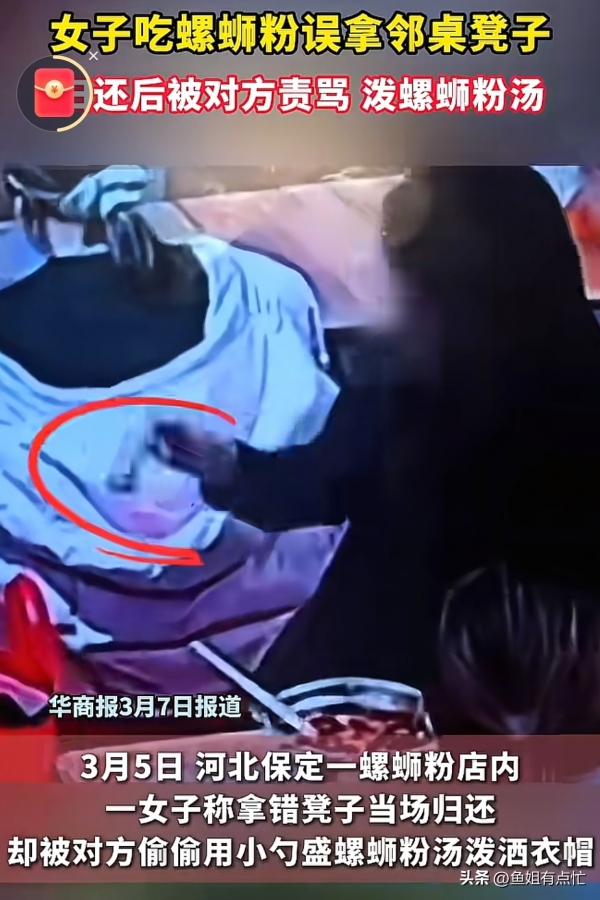 年后,大家都开始工作了,河北一家螺蛳粉店也像往常一样人满为患,晚上6点,正是用餐高峰期,一位身穿白色羽绒服的小姐姐走进店里,因为人太多了,女子点好餐就随意找了张凳子坐下来;没过多久,就听见一位身穿黑色衣服的大姐端着一碗螺蛳粉站在自己身旁,对着大伙喊到:"谁拿了我的凳子?"