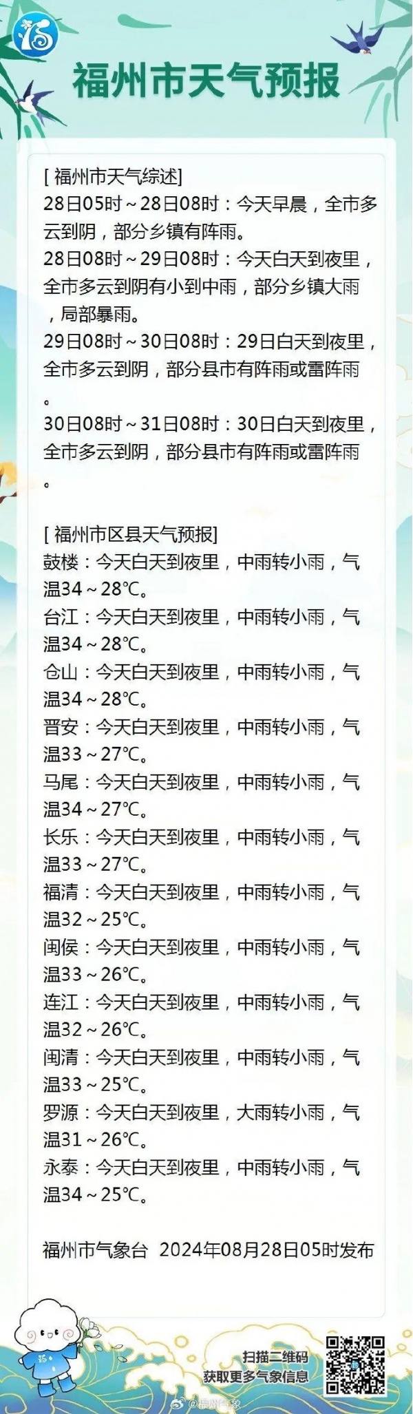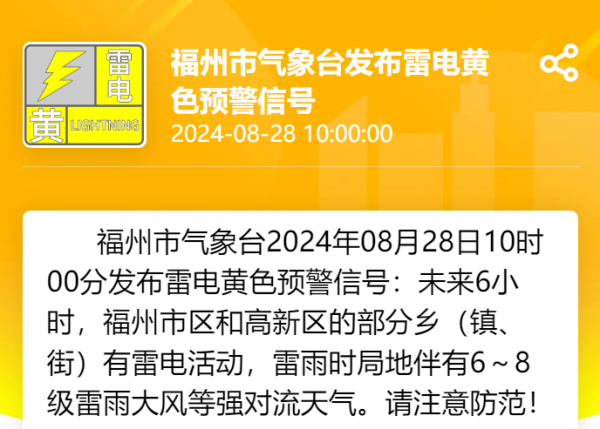 预计8月28日08时至29日08时,江苏中部、浙江东部和南部、福建、广西东部、广东、云南南部等地的部分地区有短时强降水天气,小时雨量20~50毫米,局地可达70毫米以上;另外,福建东部、广东南部沿海等地的局地仍将有雷暴大风或冰雹天气。