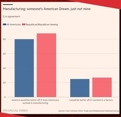 本·诺顿:我想问一下麦克,你看到《金融时报》上的这张图表了吗?有项调查问美国人,是否认为如果有更多美国人从事制造业,美国会变得更好?有80%的美国人表示同意,而且共和党人中有超过80%认为美国发展制造业会更好。但接着他们又问了一个后续问题:如果你自己在工厂工作,你会过得更好吗?结果,只有大约20%的美国人表示,他们在工厂工作生活会变得更好。因为,他们其实并不想在工厂工作,他们想要的是在有空调的办公室里做收发邮件的工作,而不是每天都站在流水线上。