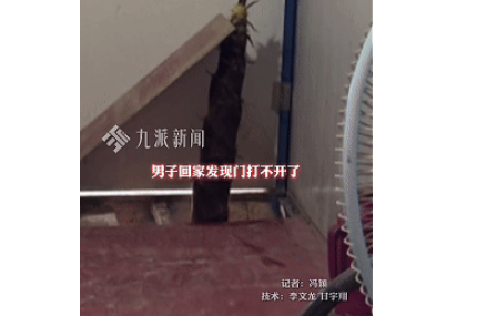 这是真笋到家了!近日安徽宣城,男子出门一个星期,回来发现门打不开了,钥匙插进去怎么拧都没用,实在没办法,只能趴在窗户上往屋里看,结果这一看直接吓了一跳,门缝底下硬生生卡了一根竹笋,又粗又壮,正好把门口堵住,把门从里面给顶死了。