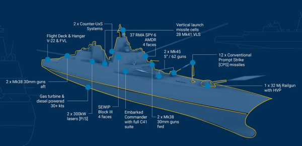 尽管这是一艘史无前例的大船,熟悉该计划的两名消息人士告诉美国海军学院新闻网站,这艘战舰的武器系统并不算新。该舰将部署AN/SPY-6空中搜索雷达,128个MK-41垂直发射系统单元,12枚常规快速打击远程高超音速导弹和5英寸炮。