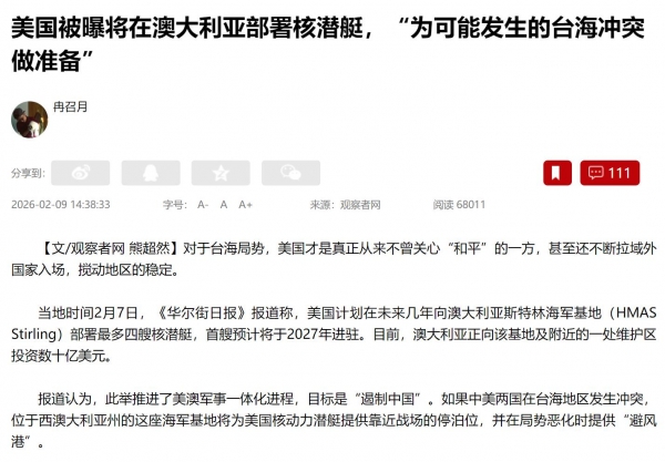 美媒毫不掩饰其目的,直言这批核潜艇部署到澳大利亚,就是在为台海潜在冲突做准备,作为美军的后勤基地,以及冲突时调兵遣将和部署武器的所谓"避风港"。