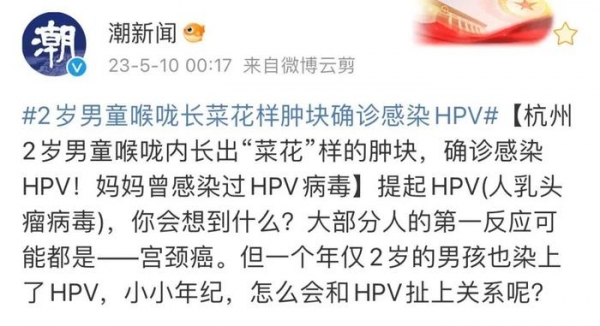杭州一2岁男童竟被确诊感染HPV,喉咙长出"菜花"样的肿块。