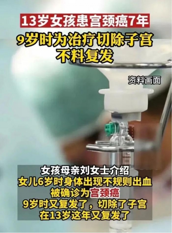 还有13岁女孩患宫颈癌7年,9岁时为治疗切除子宫,不料竟然复发了。