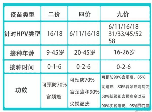相信大家都知道,目前市面上有的HPV疫苗有二价、四价、九价三款疫苗,不同疫苗针对HPV类型也不同。