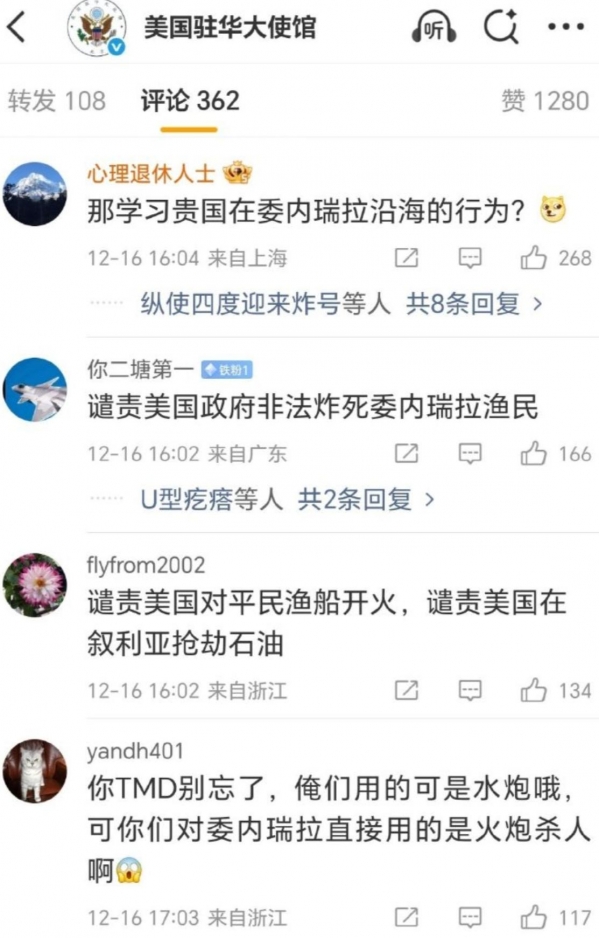 强盗也有资格指责别人吗?所以在美大使馆这次发文的下方,评论区网友清一色地嘲讽美国,有说要学习美国在委内瑞拉沿海行为的,有拿中国海警水炮对比美军火炮的。但说来说去,这么多网友的意思基本一致:美国没资格指责中国。