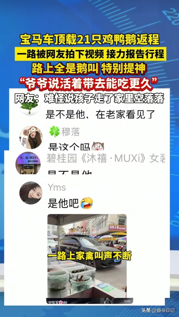 春节返程的高速上,一辆宝马硬生生火出了圈!车顶驮着21只鸡鸭鹅一路嘎嘎叫唤,800公里路程足足开了20多个小时,豪车配家禽的离谱反差,直接把路过的车主都看呆了,网友们更是一路接力跟拍,把这事刷成了全网热梗。车主那句掏心窝子的话,更是戳得无数人眼眶发热:大家羡慕的从来不是车和鹅,是被爷爷奶奶疼到骨子里的幸福!