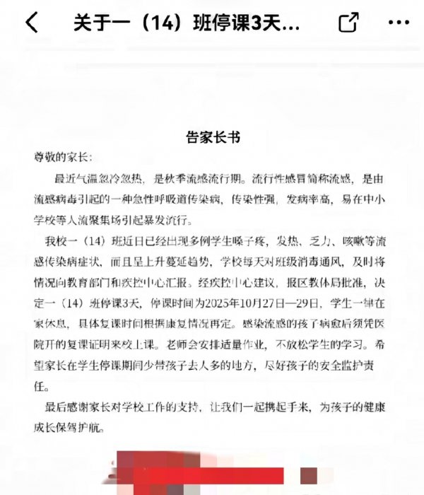 家住绍兴的李女士告诉记者,她的孩子所在班级因多名学生出现流感症状,从本周一开始停课三天。学校在通知中说明,近期班级内流感病例增多,已向教育部门和疾控中心汇报,并对教室进行每日消毒和通风,复课时间将视学生康复情况而定。