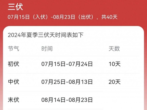 今天是公历7月15日,农历六月初十,是今年"三伏天"正式"入伏"的日子,三伏天从7月15日开始,一直延续到8月23日,共计40天。