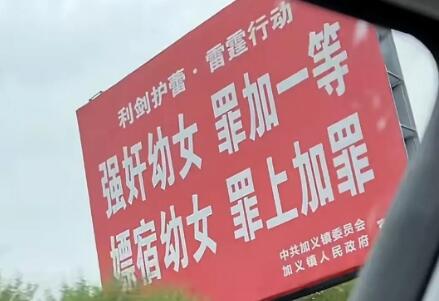 7月14日,有网友拍下湖南省岳阳市平江县加义镇公路两旁竖起多块"禁止强奸幼女","隐私部位不能摸"等标牌并发到网上。引起热议和无端猜测后,当地相关部门工作人员回应称:"这样做,一是为了响应上级的号召;二是加义镇大,人口比较多,旅游旺季,流动人口也多,不希望发生这种事情。"