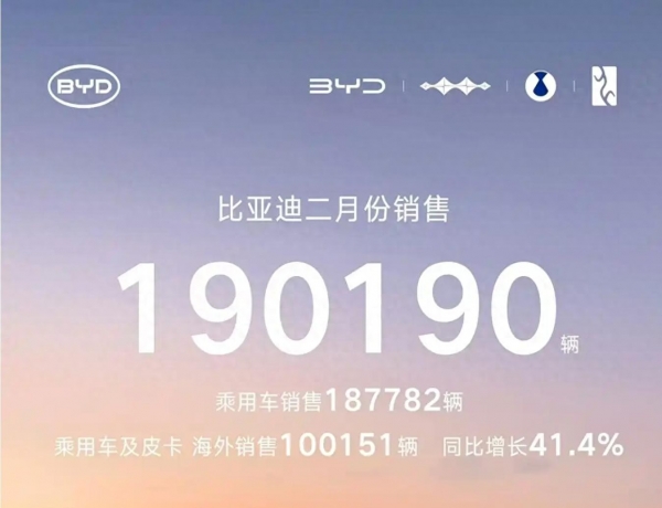 比亚迪2月份销量达到190190辆,其中,王朝/海洋销量为165013辆;方程豹卖出17036辆;腾势达到5501辆;值得一提的是,乘用车及皮卡海外销售100151辆,同比增长41.4%。跟国内对手相比,比亚迪汽车在海外市场布局的速度更快,有点国内"开花"国外"香"的意思。