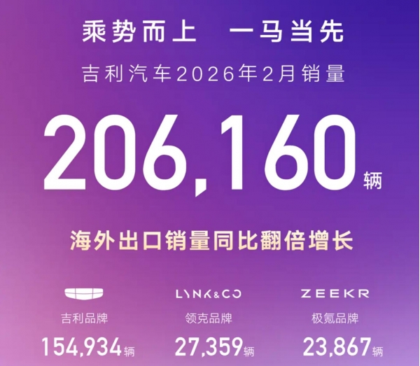 吉利汽车:2月销量20.6万辆