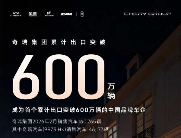 奇瑞集团:2月销售汽车160765辆