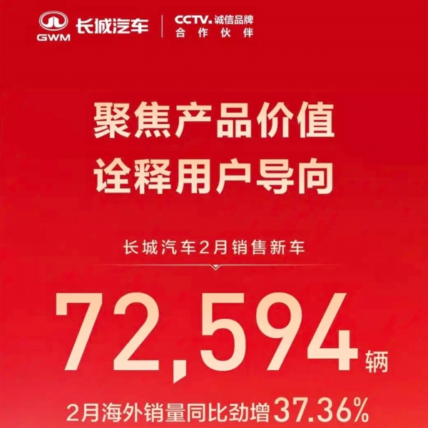 长城汽车:2月销售新车72594辆