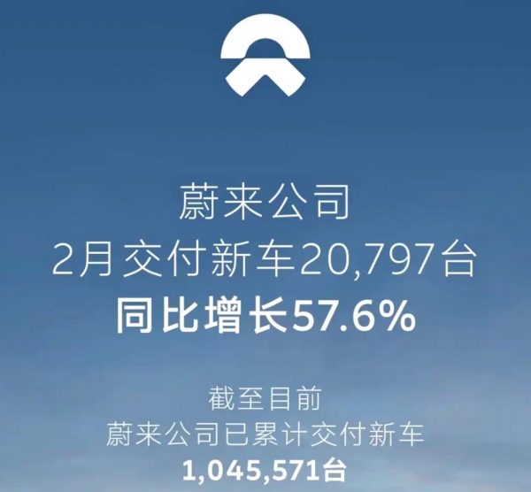 蔚来汽车:2月交付新车20797台