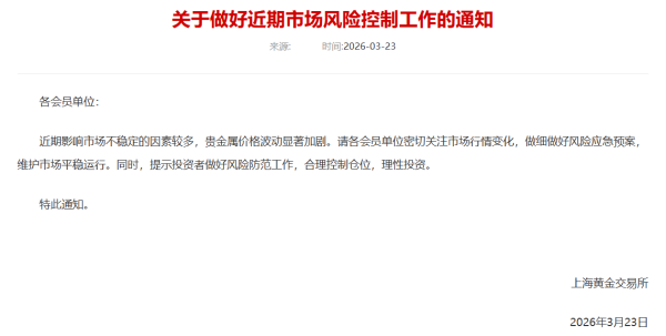 据上海黄金交易所网站消息,3月23日,上海黄金交易所发布关于做好近期市场风险控制工作的通知: