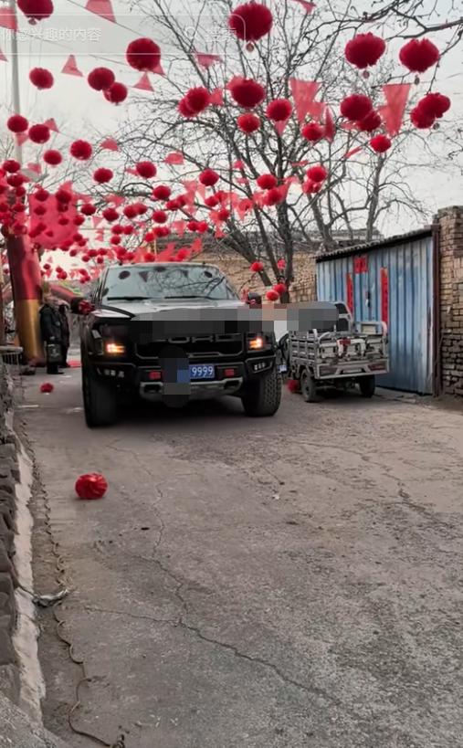 等直升机将新娘新郎送到新郎所在的村子后,一辆有着尾号的999的车牌,跑到下机的地方接新郎新娘。