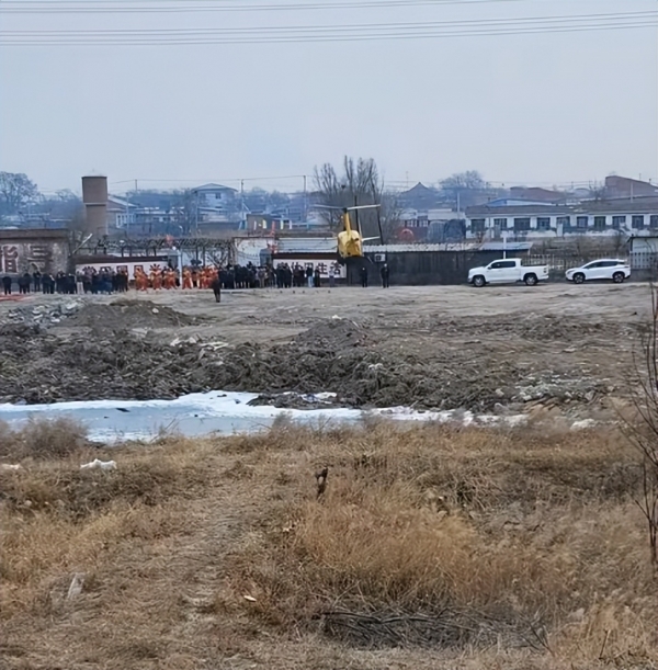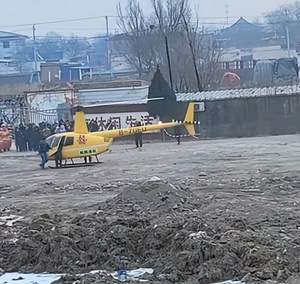 1月29日,有多名网友在社媒晒出了一架黄色直升机的照片,照片中直升机停在一处空地上,上面明显写着大红色的双"囍"字样。