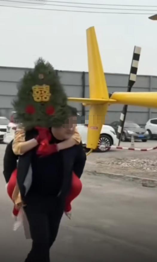该新娘手持一个囍字样的牌子,在男子背上,还有一个细节,该新娘还戴着墨镜。