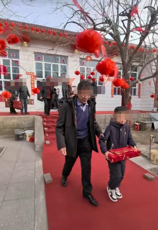 随后一行人提着大包小包出了房间,走到新郎家的院子里,一直往外走。
