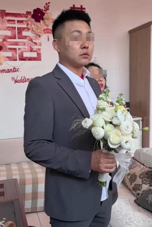 明显来看,背新娘的男子,明显是新娘的家人,而旁边灰色衣服男子,就是此次婚礼的主角新郎。