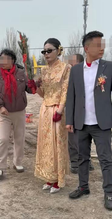 这时候新娘戴着墨镜,双手戴着红色手套,右手还拿着那张喜的牌子。