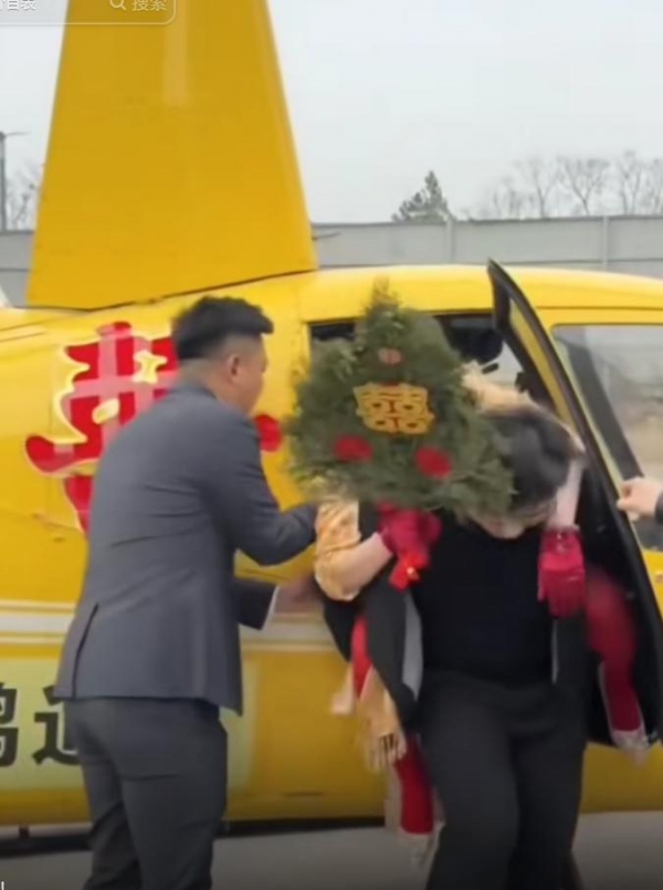 还有网友更是晒出了直升机在酒店接亲的视频,在山西某酒店里面,一名男子背着一名身穿喜服的女子,走向接亲的黄色直升机。