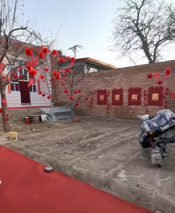 看新郎家的院子不是很大,但是典型的农家小院,房间外弄了白色瓷砖,因为是办婚礼,所以整个院子都装饰了一番。