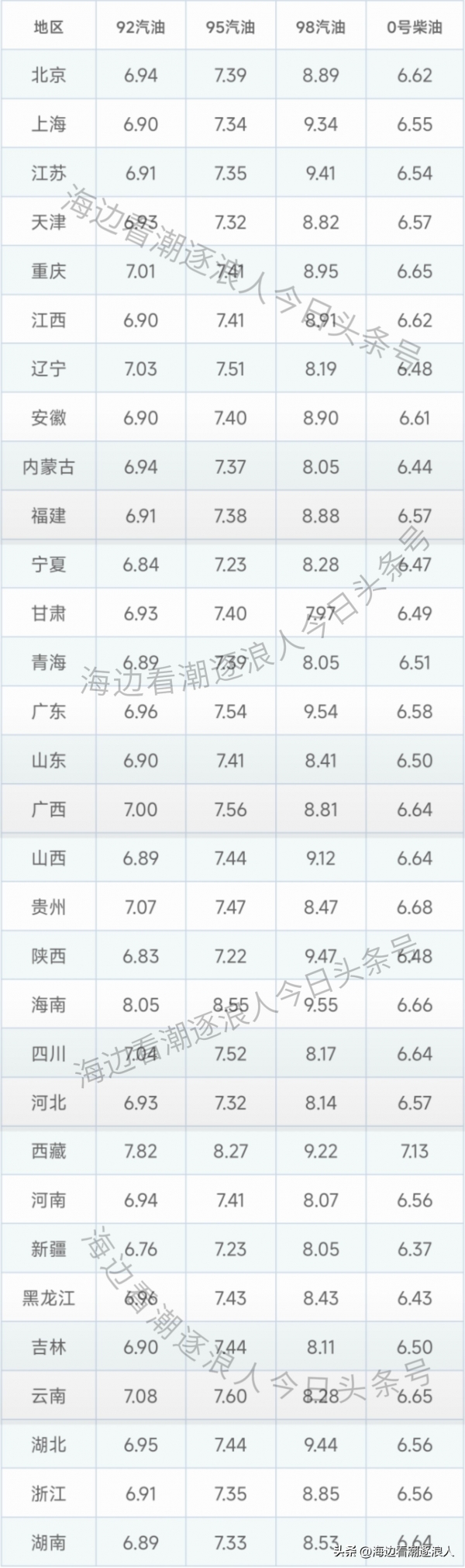 对于黑龙江、云南、陕西、西藏、四川、内蒙古、贵州、青海、新疆等省份的油价没有实行统一价格,这边列出的是省会城市的最高零售价格。