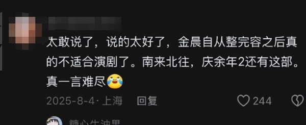 也在《南来北往》中因为光滑稚嫩的脸跟剧中质朴的年代氛围格格不入,也被网友说金晨不适合演古装剧。