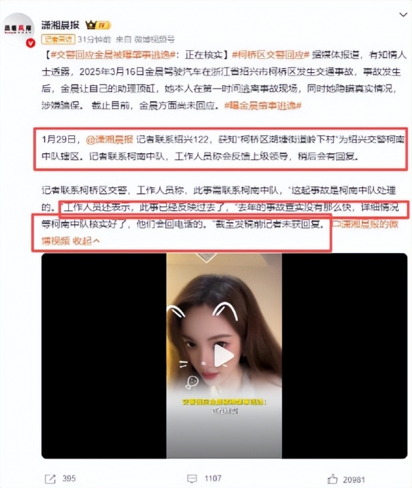 金晨被曝肇事逃逸让助理顶包一事持续发酵。1月30日,记者联系浙江省绍兴市柯桥区公安局政治处,工作人员表示,目前此事仍在进一步调查中,没那么快。有调查结果后或将进行通报。