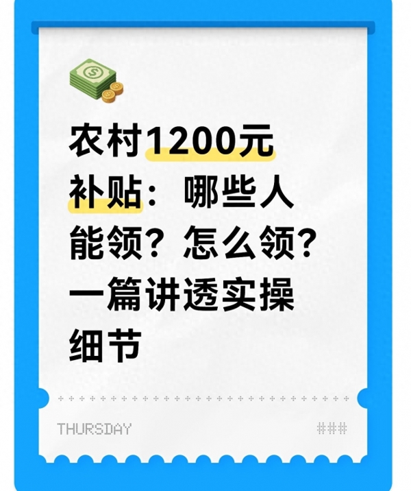 最近不少农村朋友在问,传说中的1200元补贴到底谁能领、怎么领?其实这笔钱不是全国统一的"普惠福利",而是国家涉农专项补贴的常见核算结果--有的按亩累加、有的定额发放,核心针对3类特定农村群体,各地仅微调标准,申领流程已大幅简化。今天用大白话把条件、流程、细节说透,对照着就能自查,别让该得的福利溜走。