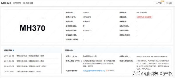 值得一提的是,马来西亚航空公司也曾于2014年7月申请注册一件"MH370"商标,国际分类为第9类-科学仪器,该商标申请于2015年被驳回,目前处于无效状态。